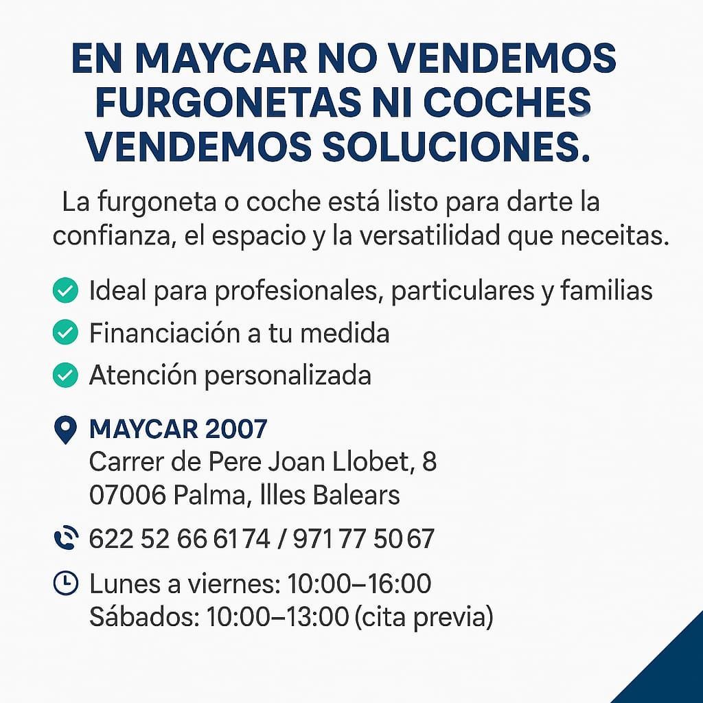 Bienvenido a la sección de Coches de Ocasión en Mallorca de Maycar 2007. Aquí encontrarás una selección rigurosa de coches y furgonetas de segunda mano, todos ellos revisados por nuestro taller mecánico en Mallorca y listos para ser tu próxima solución de movilidad. Actualizamos constantemente nuestro inventario con modelos que cumplen nuestros altos estándares de calidad y precio. Contáctanos directamente si no encuentras el modelo que buscas y te ayudarmos a encontrarlo.