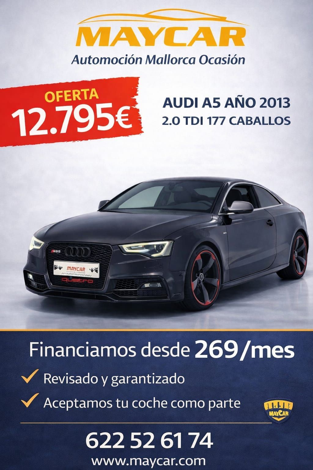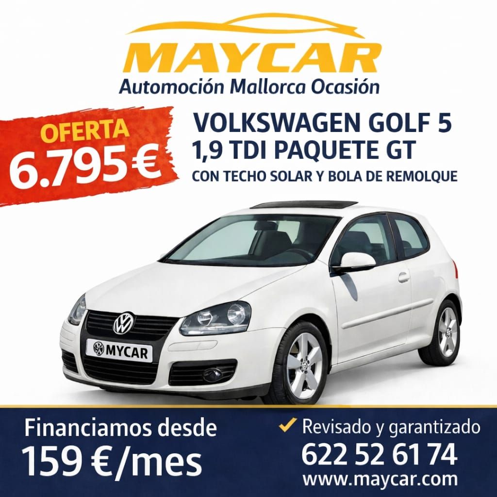 En Maycar, cada vehículo viene con la garantía de nuestra experiencia de más de 15 años en la compraventa vehículos Palma. Además, te facilitamos la adquisición con nuestra financiación coches segunda mano flexible, pudiendo cubrir hasta el 100% del valor. Ofrecemos precios a tu medida y aceptamos tu vehículo actual como parte de pago. Queremos asegurarnos de que la compra sea tan transparente como placentera.